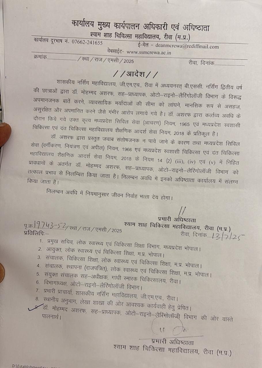 रीवा। नर्सिंग छात्राओं से दुर्व्यवहार के आरोप में ENT विभाग के सहायक प्राध्यापक डॉ. मोहम्मद अशरफ को निलंबित कर दिया गया है। मामले की शिकायत के बाद डीन कार्यालय द्वारा जांच की गई, जिसमें डॉ. अशरफ को दोषी पाया गया। जांच रिपोर्ट के आधार पर डीन ने उन्हें तत्काल प्रभाव से निलंबित कर दिया है।