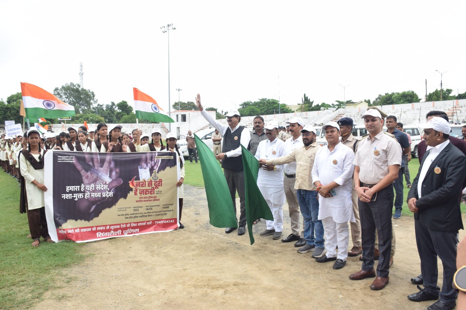 सिंगरौली। पुलिस मुख्यालय भोपाल के निर्देशन में नशामुक्ति जन जागृति अभियान के तहत विभिन्न विद्यालयो के छात्र छात्राओ के द्वारा रैली निकालकर नशामुक्ति के लिए आम जन मानस को जागरूक किया गया। राजमाता चूनकुमारी स्टेडियम बैढ़न में नशामुक्ति रैली को देवसर विधायक जिला एवं सत्र न्यायधीश, कलेक्टर, वन मण्डल अधिकारी,नगर निगम अध्यक्ष, प्राधिकरण अध्यक्ष के द्वारा हरी झण्डी दिखाकर रैली को रवाना किया गया।