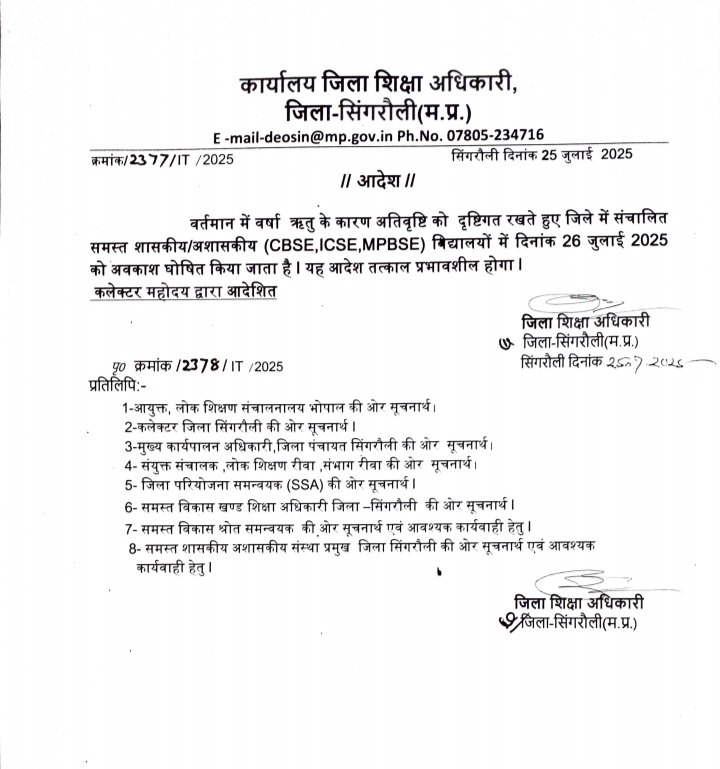 सिंगरौली। आज जिले मे अत्यधिक बारिश को देखते हुए सभी स्कूलों में अवकाश घोषित कर दिया गया है।