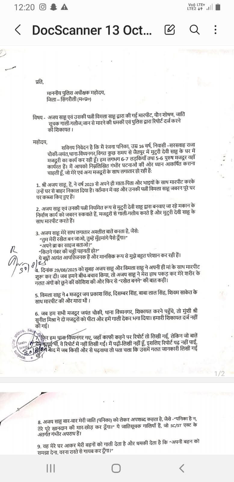 सिंगरौली। जिले के विंध्यनगर थाना क्षेत्र में एक नाबालिग लड़की द्वारा लगाए गए सनसनीखेज आरोपों ने प्रशासन की कार्यशैली पर सवाल खड़े कर दिए हैं। पीड़िता ने अपने नियोक्ता अजय साहू और उसकी पत्नी विमला साहू पर यौन उत्पीड़न, मारपीट, जातिसूचक गालियाँ देने और जान से मारने की धमकी देने का गंभीर आरोप लगाया है।