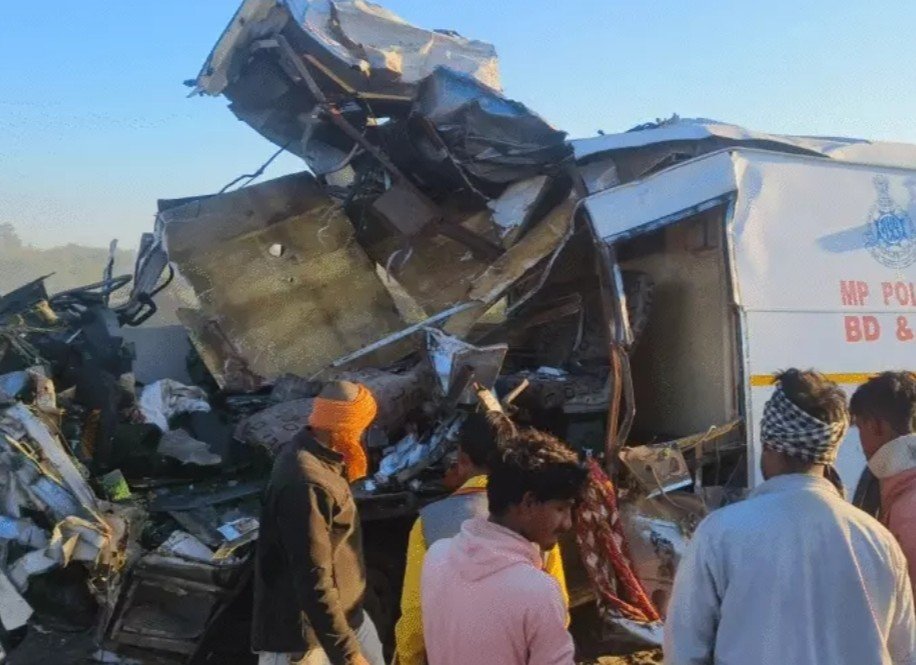 सागर NH-44 पर भीषण हादसा: पुलिस वैन-कंटेनर की टक्कर में BDDS टीम के 4 जवान शहीद, एक गंभीर