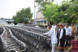 विधायक ने छात्रो को वितरण के लिए तैयार की जा रही सायकलो का किया निरीक्षण।