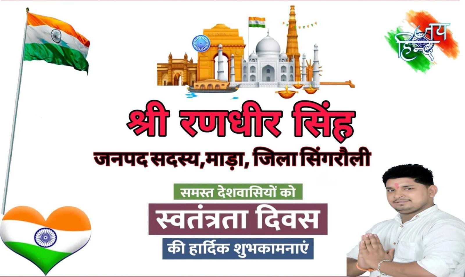 सिंगरौली। श्री रणधीर सिंह जनपद सदस्य माड़ा की ओर से सभी देश वासियो को स्वतंत्रता दिवस की हार्दिक शुभकामनाएं
