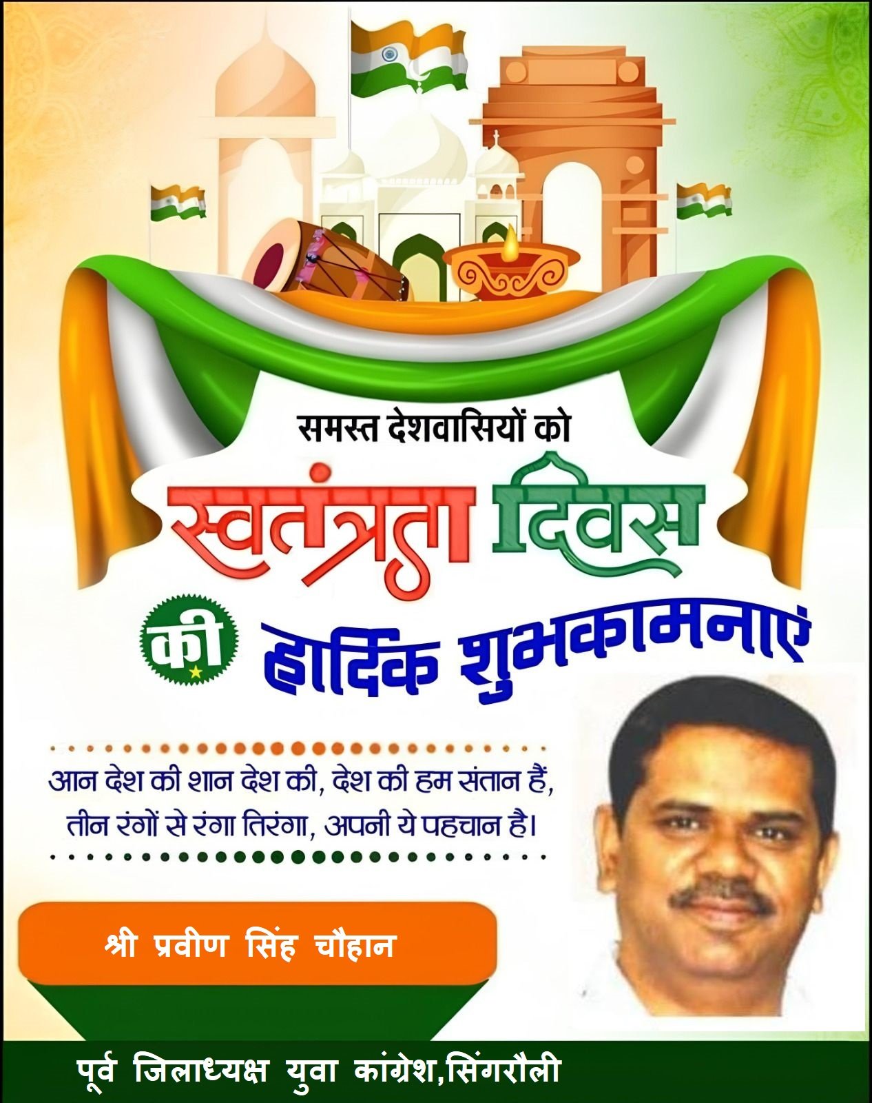 सिंगरौली। श्री प्रवीण सिंह चौहान की ओर से सभी देश वासियो को स्वतंत्रता दिवस की हार्दिक शुभकामनाएं